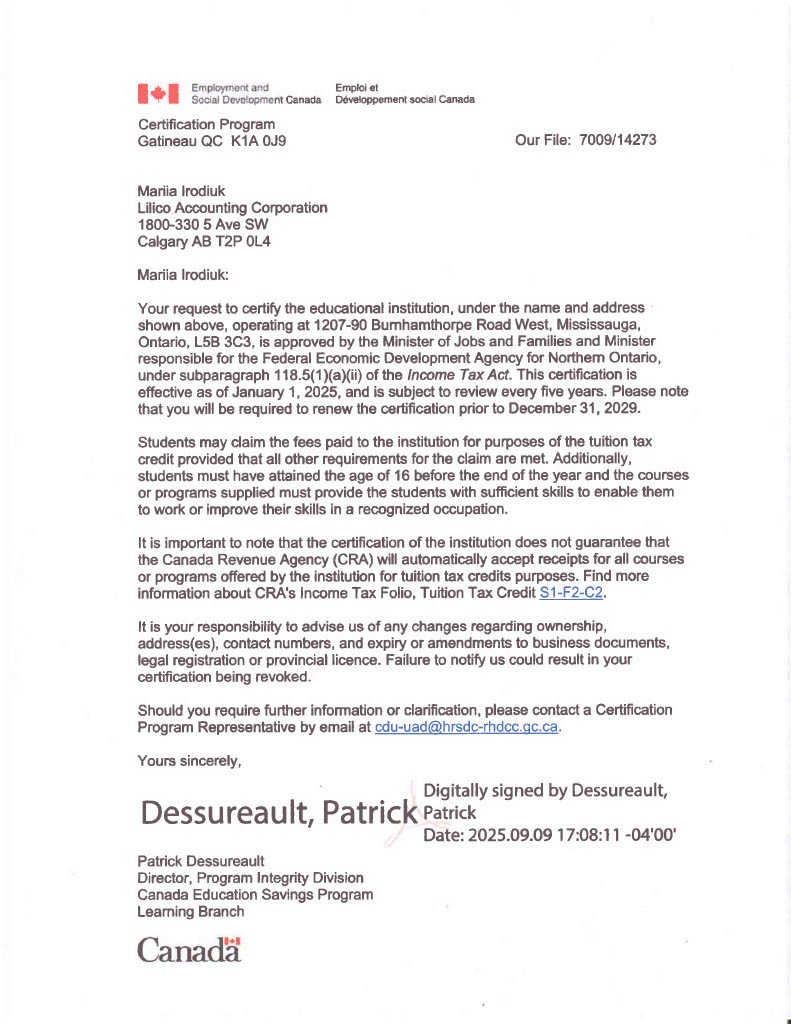 We are an accredited educational institution by the Minister of Jobs and Families, and that means that our students can receive the T2202 form to claim a tax credit for their tuition fees. Every year, in February we issue the forms to all of our students.